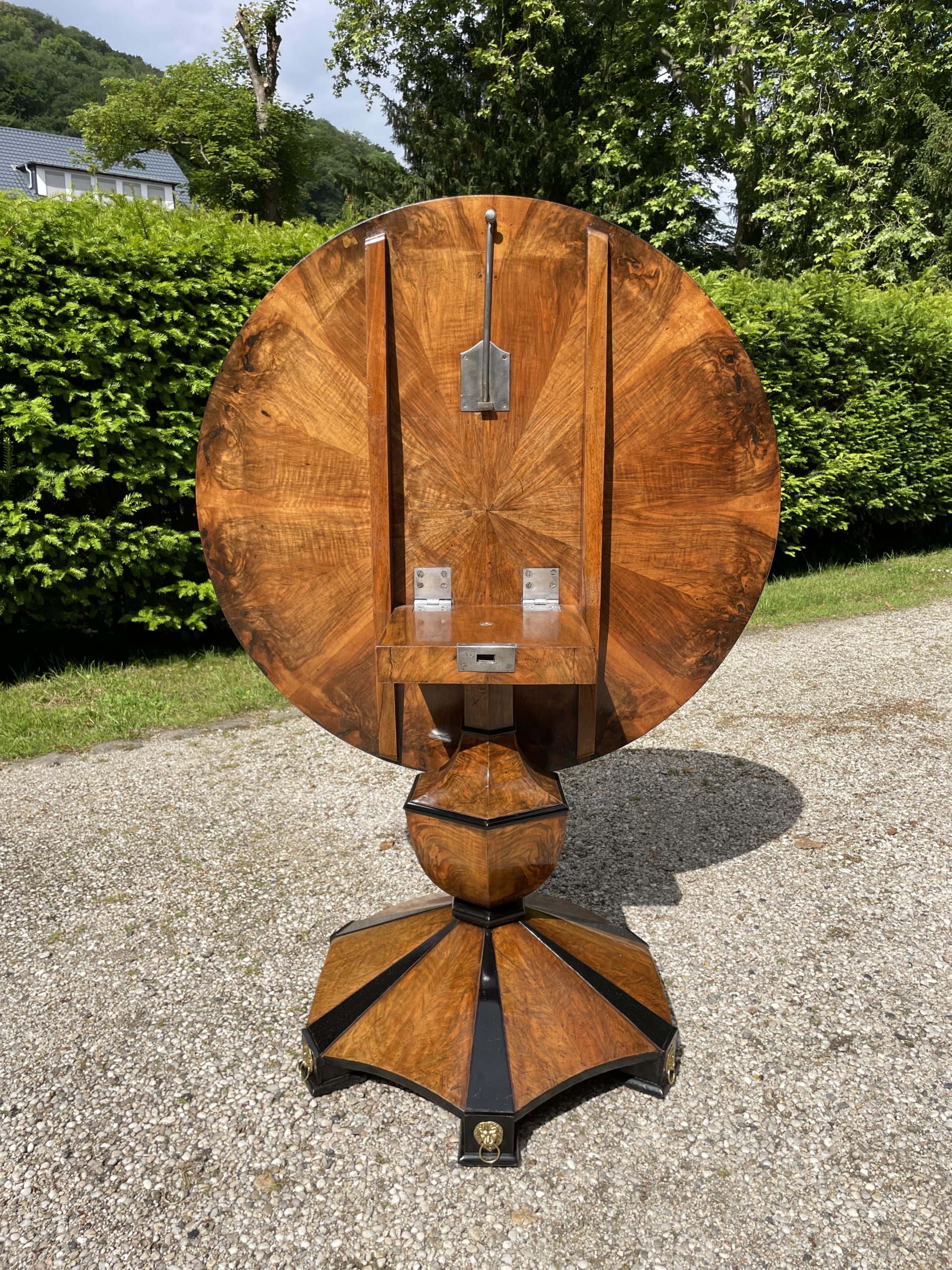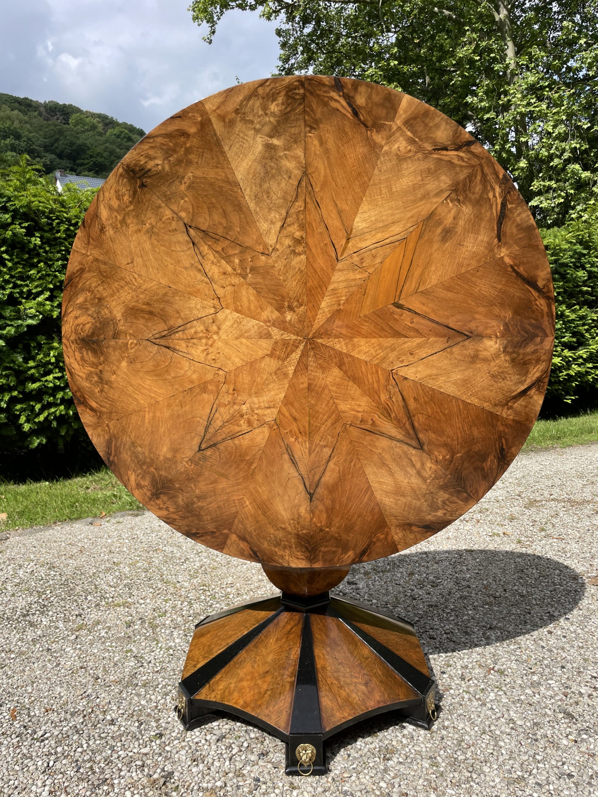 DIE TISCHPLATTE MIT AUFWENDIGEM STERNFURNIER AUFSTELLBAR ÜBER BALUSTERARTIGEM SCHAFT , DER IN EINEM HEXAGONAL EINGEZOGENEM UND TEILS EBONISIERTEM SOCKEL ENDET. DIE BODENKLÖTZE MIT GETRIEBENEM LÖWENMASKEN VERZIERT.
